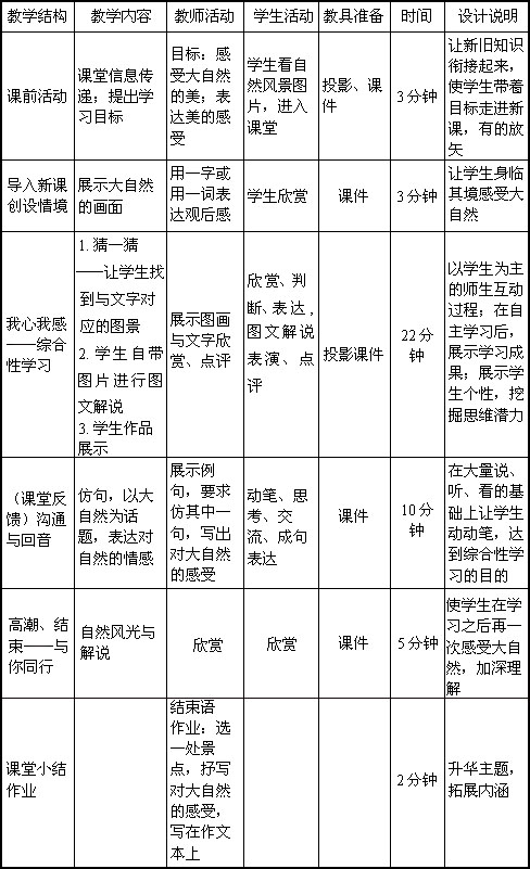 福建省厦门金鸡亭中学 柯蝴蝶 综合性学习是课程标准中的新内容,是语文教学中一个新课题,没有多少经验可供借鉴,作业一个尝试,下面我就这节课做简要说明。 首先谈谈教材内容及特点,是新课程标准教材七年级上册第三单元的教学内容。这次综合性学习围绕感受自然展开,没有现成的教材。教材来自学生收集、整理、加工的材料,来自于教师的知识准备,资料的准备。大自然是富饶、美丽、慷慨的,它给予人类取之不尽的食物,饮之不尽的清泉,呼吸不完的清新空气;自然又是多情可爱的,它所拥有的山川草木,风花雪月、蓝天、黑土、大漠、绿洲,激发了一代又一代风格各异的人们,大自然真是神奇而伟大!大自然本身就是一本教科书,一本美学教科书,一本哲学教科书,一本优秀的文学画卷。多姿多彩的大自然可以陶冶人们的情操,激发学生的审美情趣、提高学生的文学素养。因而,借助这次综合性学习,让学生上一堂美学课,上一堂文学课,意义重大。学生在搜集材料中涉猎了大自然的许多方面,与大自然进行沟通对话,与同学实现了合作。在这种教材的指导下,听说读写,尤其是口语交际渗透于综合性学习中,在综合性学习中提高写作与口语交际能力,提高审美能力。 从教法看,本节课着重从以下几方面贯穿新课程标准的理念: 1. 解放学生的手,解放学生的眼,解放学生的嘴,解放学生时间、空间,解放学生的大脑。让学生动手收集材料:优美多姿的山川,五彩斑斓的大自然,让学生一饱眼福;让学生表演、七嘴八舌表达情感;让学生大胆想像、联想,丰富自己。从材料搜集、整理到成果展现,学生经过许多酸甜苦辣,但每一种滋味都是宝贵的。 2. 注重创设情境。在钢筋水泥房里感受大自然,不免有些遗憾。但大量自然风光图景弥补了不足,使学生能身临其境感受大自然。 3. 把听说读写特别是口语表达融汇课堂中,注重学生能力的全面提高,更注重全部学生能力的提高。 从学法上看,本节课力求使学生巩固一些学习要求,改变不好的学习习惯。 1. 动手、动脑习惯。这是主动学习的表现。课前收集、整理材料,准备解说词,让学生养成好思考好动手的习惯。 2. 敢于表现,显示风度。在对学生口语交际评价中一直提到“现场风度”,因为它是一个人为人处事的素质,不可忽视的能力。在不断练习实践中,提高个人的应变能力。 3. 协作精神。本节课涉及小组活动,要求他们团体合作,也只有这样,才能创造出好作品。 最后我就本节课的教学安排作简要说明。