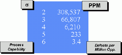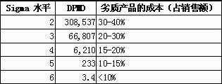 ![]() ![]() CPK=Min of ![]() Cp与Cpk 叫作过程能力指数,图中的USL 与LSL为规格的上下限。当USL与LSL为X 正负6σ且X=(USL-LSL)/2时,Cp与Cpk=2。这也就是我们上面提到的情况,既6sigma水平,既不良PPB=2.但实际上,Cp=2 是可以做到的,而CPK=2是基本上做不到的,因而人们普遍采用Cp-0.5=Cpk的这一摩托罗拉公司的假设,既把Cp=2 且Cpk=1.5 看作6 Sigma.如下的一组数据也是在Cp-0.5=Cpk的假设条件下得到的,当然实际上可能有所不同。 如下是Dppm值与Sigma的对应关系: ![]() 大家可以看到,6sigma意味着3.4个DPPM。基本上接近零缺陷。 通过上面的学习,我们知道6Sigma是一种接近完美的品质,现如今人们由统计学方面进而延伸,已经赋予6Sigma一个全新的含义,将追求完美质量提高客户的满意度,通过解决工作中的问题,追求公司自身的全方位提高,变成为不断推行6Sigma的行动。6Sigma已经成为: 1)6Sigma是用来经营一项生意的战略。 2)6Sigma 是在各种各样的行业中形成的用来加快改进步伐的经营管理系统。 3)6Sigma 是一系列的过程,它将选择的方法、技术、实际行动联系在一起。 4)6Sigma 是由管理原理、统计技术、全身心投入的员工一起精心构造的系统。 5)6Sigma 是用来解决问题和消除偏差的工具。 6)6Sigma是一种企业文化。 为何要推进6Sigma? 现在世界上绝大部分公司的制程保证能力及各种管理水平处于3至4Sigma.。包括联想在内,我们也是大致上处于这个水平,制程保证能力指数好说,我们可以通过计算QC的不良品率来计算,那其它方面的Sigma水平是如何来的哪?大家知道,说一个公司好与不好,并不是张口一说的问题,它有很多的达标标准,我们这个数据是通过对我们公司的各个重要评估参数进行评估的结果。比如讲:我们的生产不良品率,我们发工资出错率,我们的测试软盘发放出错率等。好比说,我们对发工资出错情况进行统计,发现在两个月共发出工资条10000张,其中有3个人的工资发错,那我们的DPPM就是300。大家对照上表可以看出,这种水平是处在4Sigma 与5Sigma之前,接近5Sigma。大家可能觉得3Sigma已经不错了,但大家知道这意昧着什么吗?请看如下的一组数字: 如果全世界各行各业都以达到3Sigma 为合乎要求,则有如下的结果: 每个星期5,000次医疗事故。 每小时有20,000 封信送错地方或丢失。 每月有7个小时的停电, 每天有15分钟会饮到不安全的水。 那对于公司来讲,达到的Sigma水平不同,则质量成本就不同,请看如下一组数字: