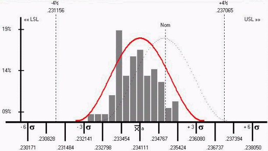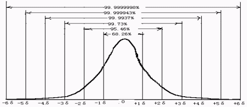 什么是6Sigma 21世纪已经来临。在20世纪中人类取得了巨大成就:生产力高度发展,产品和服务质量不断提高。正如美国著名质量管理专家朱兰(J.M.Juran)1994年在美国质量管理学会年会上所说,20世纪将以“生产率的世纪”载入史册; 21世纪是“质量的世纪”。质量必将成为新世纪的主题,它正在向我们挑战,我们必须迎接它的来临。 由于20世纪生产力的不断发展,特别是少数经济大国的崛起,使得国际市场的竞争愈益激烈。而今质量管理界已流行“世界级质量”之说。所谓“世界级质量”也就是世界最高水准的质量。任何国家的产品和服务,如果达不到世界级质量的水准,就难以在国际市场的竞争中取胜,参加世界贸易组织的国家,在无法采用关税壁垒等保护方式的情况下,甚至难以在国内站稳脚跟。过去在质量管理中有所谓“3Sigma法则”,即在稳态下不合格品率达到2.72‰(10-3,千分率)的水平,而现在则提出“6Sigma法则”,即在稳态下不合格品率达到2PPB(PPM即Parts Per Million,10-6,百万分率,PPB即Parts Per Billion,10-9,十亿分率)的十亿分率水平。也就是说,对不合格品率的要求比过去严格了2.2‰ / 0.002PPM=135万倍。这就是我们所面临的质量挑战的国际环境。 这里提到Sigma这个词,大家可能不知其为何物,那我们先来对Sigma作一个解释; Sigma符号:σ是一个统计学术语,即质量特性值分布的总体标准差。它等于; ![]() 让我们对X,x,n等来作一个解释。假设我们量一个园柱的直径,我们量了一组数据: ![]() 假设这组数据是从12个工件量得的,我们测量的目的是为了看这些零件的直径是否符合我们的要求,如发现问题则采取行动以防止不良品的发生。那x就是这上面的12个数据,而X则是以上所有数据的平均值: ![]() n是所测量值的个数。 统计学发现:对于许多连续型随机变量来说,其概率颁分布是一种呈铃状的对称曲线,叫作正态曲线。如图所示: ![]() 这是统计学中最普通也是最常用的一种分布,那何为连续性随机变量呢?在引入随机变量之前,让我们先给大家讲一下何为随机试验: 在概率论与数据统计中,做事情称为试验。具有以下两个特点的试验,称为随机试验: ①在相同条件下,可以重复进行,且每次试验的可能结果不止一个。 ②不能准确预言每次试验所出现的结果,但可以知道可能出现的全部结果。 一般地对于随机实验,若其试验结果可用一个变量的取值表示,这个变量取值带有随机性,并且取这些值的概率是确定的,则称这样的变量为随机变量。若随机变量x的所有可能取值为某一区间,则称x为连续型随机变量。所谓概率是确定的意思是讲x取某一个值的可能性是预先知道的,如:x取3.11的可能性是30%等。 例如:在某生产车间正在生产螺丝,生产工人按照产品规格生产螺钉,我们知道生产螺钉规格是某一区间,如:25—27cm在这之间的为合格品。员工按照这个规格生产产品,如果我们对他生产的产品进行分析,就会发现,这些螺钉的长度是符合如上的正态分布的。 通过计算发现: 在X 正负3σ范围内集中了99.7%的产品。 在X 正负6σ范围内,集中了99999999.8%的产品。 如果我们将规格定好,那只有符合规格的产品才是合格的产品,如果在规格范围内集中的是X 正负3σ的产品,则我们知道有99.7%的产品合格;如果在规格范围内集中的是X 正负6σ的产品,则我们的产品有99999999.8%符合规格。如上是理想的状况,也就是我们的规格恰好就是X正负6σ,实际情况是X很难是规格的中心线。为了比较容易说明,我还是给大家引入CP与CPK的概念: 请看下图: