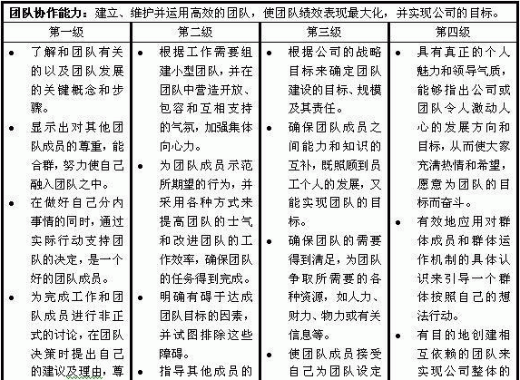 全员核心胜任能力:是公司价值观、文化及业务需求的反映,是针对组织中所有员工的、基础且重要的要求,它适用于组织中所有的员工,无论其所在何种部门或是承担何种岗位是针对组织中所有员工的。 序列通用胜任能力:是依据员工所在的岗位群,或是部门类别不同而需要的专业知识、技巧及能力。在多个角色中都需要的技巧和能力,但重要程度和精通程度有所不同 序列专业胜任能力:在某个特定角色或工作中所需的特殊的、独特的技能。 四、如何构建基于公司战略与核心竞争优势的胜任能力模型 首先,明确公司的战略目标、价值观及核心竞争因素;从公司的价值观、使命及核心竞争因素归纳员工的核心能力素质。 其次,从公司的业务及各岗位群的职责出发,设计各岗位群所需的序列通用胜任能力;从各个岗位的职责和业绩优劣者的表现出发,设计各岗位层级的序列专业能力。 第三,分析全员核心胜任能力、序列通用胜任能力和序列专业胜任能力,设计每个能力的主要行为表现指标。 第四,根据专家数据库和BEI中的记录,分析设计胜任能力的各级行为表现; 第五,验证并应用胜任能力模型。 胜任能力模型示例: 五、胜任能力模型在人力资源管理中的应用 基于胜任能力模型的人力资源管理,无论在理念还是在方法方面,都有别于通常的人力资源管理。下面从四个方面来阐述胜任能力模型在人力资源管理中的应用。 第一、胜任能力模型在招聘与任用中应用