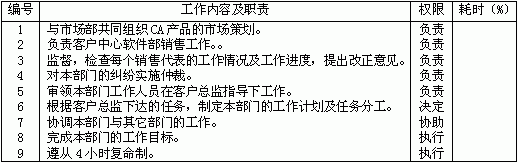 资料编号:003 二、工作内容 1、工作概要 负责客户中心CA软件部门的销售 2、职务说明(逐项说明工作任务、职责、权限、时间消耗) 三、工作关系: 四、任职资格: 五、工作场所: 六、考核标准: 1、工作绩效: 1)工作质量 2)工作数量 2、工作态度: 3、工作能力: 4、专业知识: 5、领导能力 6策划能力 7、授权指导 8、协调沟通 9、品德言行 10、成本意识从以上十个方面来考核 七、备注: 直接上级: 该职务执行人: 年 月 日 |