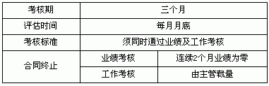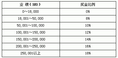 一、 佣酬:(核实业绩) 1. 固定薪资:1000元RMB/月 2. 交通补助:300元/月 3. 手机补助:200元/月 4. 业务奖金:当月业绩达成基本责任额时,可领取业务奖金500元RMB 5. 餐费补助金:每月补助餐费为220元RMB 6. 达成奖金:当月业绩额超过18,000元RMB时,开始领取达成奖金。奖金比例如下: ![]() 5. 持续奖金:每周举绩15,000RMB以上,连续3周,发放持续奖金1000元RMB 6. 杰出奖金:当月业绩超过10万元RMB,且为上海及北京两地业务人员业绩评比的第一名时,加发杰出奖金1000元RMB 7. 年终分红:当次年农历春节仍然在职者,可领取年终分红。年终分红的额度为个人全年业绩的百分之二 8. 业绩定义: a. 当成交价等于定价时,业绩以成交价的百分之百计算 b. 当成交价不等于定价时,业绩之计算方式由市场部主管会同总公司财务部精算后决定 c. 开拓经销商及代理商业务,不列入业绩计算,酬佣办法另订 d. 受理业绩:当财务部接到客户订金?quot;整笔订单业绩额" e. 核实业绩:当财务部接到客户尾款之"整笔订单业绩额" 9. 酬佣之计算均以核实业绩计算 二、 考核:(核实业绩) 1. 业绩考核:每月基本业绩考核额度为18,000元RMB 2. 工作考核: ⑴ 差勤考核:须按公司规定办理。 ⑵ 活动量考核:a.每周拜访量不低于13个(拜访量是指与客户面对面之销售约会的次数) b.每日电话拜访数不低于20个 ⑶ 行政工作考核:业务人员须按时且确实填写业务报表(含:活动管理表、客户资料表、电话记录表、潜在客户名单) 3. 合同的维持: ![]() 三、 晋升(核实业绩) 1. 晋升前六个月个人业绩总额达30万RMB以上,其中连续3个月每月核实业绩达到40,000RMB以上。 2. 无重大违规记录 3. 由直属主管推荐,经市场部主管批准,得晋升为客户经理 四、 法自2002年4月23日起实行,再修订 信息来源:中人网 |