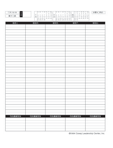 一周计划表 我们的计画表与一般时间管理法的表格不同的地方是以周为单位,而非以天为单位。以周为单位的好处是可以培养整体感。 一日型的计画表会使人目光局促,因为只看到眼前,于是我们只问事情急不急,多快可以完成,却不问重不重要,能做得多完美。反之,以周为单位,我们会有更宽广的视野,也才能以相对重要性的观点来评量每日的生活。 步骤一:与使命连结