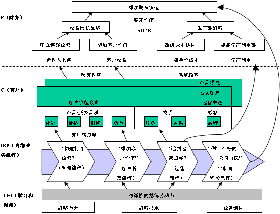 卡普兰教授曾经说过:不能描述的事情就不测量,不能测量的事情就不能管理。据开普兰教授统计的数据显示,只有10%的组织实施他们的战略。那么实施战略的障碍在哪里呢?只有5%的人理解战略、只有25%的人享有与战略相关的激励、85%的管理团队讨论战略的时间不足一个小时、60%的组织没有将战略与预算联系起来。那么这些障碍产生的原因是什么呢?主要是因为没有一个很好的描述战略、实施战略的工具。由于组织没有很好的描述战略,战略实施的效果就不可能被很好的进行评估,进而也就无法对战略进行管理。平衡计分卡工具的出现,弥补了战略实施的不足,使公司的战略得到了很好的阐述,便于员工对公司战略的理解;实现了战略与预算、预算与考核、考核与激励的对接;同时平衡计分卡成为了管理会议的主要的工具之一。 那么平衡计分卡是如何很好的描述战略、实施战略的呢? 一、 战略图----描述组织的战略 战略图,顾名思义就是描述组织战略的地图。通过把组织的战略画在一张图里,可以使管理者对组织的战略一目了然,便于对战略的理解和管理。战略图依据平衡计分卡的思想,把组织的战略分成四个纬度:财务战略、客户战略、内部业务流程战略、学习与创新战略。其中客户战略是核心。也就是说,组织战略的设计,是围绕着如何满足客户的价值取向来进行的。从财务战略来说,只有满足了客户的需求,才能获得更好的财务结果。从内部业务流程战略来说,内部业务流程的设计,是为了更好的满足客户的价值取向。从学习和创新战略来说,学习和创新是为了不断地改善内部的业务流程,以满足客户的需要。 下图是战略图的模版,它很好的表示了一个组织,从学习和创新到内部业务流程,从内部业务流程到客户,从客户到财务,这样一个层层驱动的因果关系。学习和创新是为了不断的改善组织的内部业务流程,改善组织内部的业务流程是为了不断地满足客户的需要,满足客户的需要是为了获得更好的财务结果。战略图使原本零散的、看似无关的战略联系在了一起。