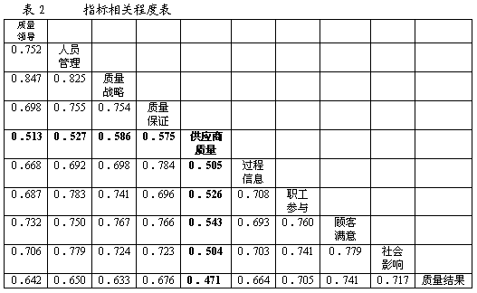 随着我国加入WTO 和国际国内市场一体化进程的加快,一些企业已经意识到与供应商建立良好的合作关系的重要性,在对供应商的质量控制方面放弃了单向有利的原则,转而寻求互利共赢。值得注意的是,目前大多数企业对此缺乏足够的认识,据上海质量管理科学研究院对上海市194家企业进行调查的结果显示,“供应商质量”的指标得分在十项指标中名列第八,而各指标相关程度,如表2所示,“供应商质量”与其他指标的相关系数相比,竟然是最小的,仅为0.5左右[1]。可见,大部分企业还没有充分认识到供应商的重要性,没有与供应商之间建立起牢固的合作关系,因此,如何加强对供应商的质量控制、建立互利共赢的合作关系已经成为企业必须认真面对的问题。