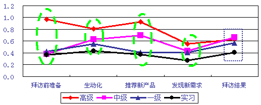 销售是维系企业生存的命脉。随着现代营销观点的推广,企业越来越认识到要长期实现销量目标除了产品竞争力外,还依赖销售部门人员的综合业务能力。 如今,在快速消费品行业,销售主管普遍采用增加人数,提高拜访覆盖面及频率的方式,实现销量提升。主管似乎只需确保新增销量利润超过新增人员成本,就可保证公司利益。这种方式是否符合企业的长期利益? 企业长期利益与销售人员业务能力状况之间具有如下关系链: ·企业长期利益能否维护的关键是企业对其产品市场的控制能力,具体表现为:消费者产品接收度及客户保持率; ·销售人员的市场基础工作质量(如产品可见度、客户服务水平)是影响消费者接收度和客户保持率的重要因素; ·销售人员的业务能力是其市场基础工作质量的决定因素; ·全体销售人员的业务能力状况决定了销售部门人员的综合业务能力状况。 因此,科学认识销量、销售人员业务能力及产品市场基础工作质量的关系成为正确解决以上问题的关键。 2001年11月-12月期间,我们在多家可口可乐装瓶厂作了关于以上关系的研究,获得数据如下: (注:1、我们建立了四级业务技术能力等级划分制度;2、纵坐标表示单项技能达标率水平状况。)