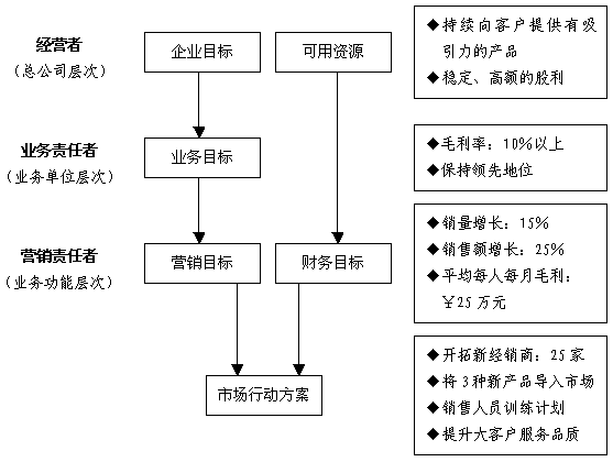 四、年度营销目标设定举例 下面,笔者列举一些定性的、定量的目标供读者参考: 1、定性的年度营销目标 1) 维持10%以上的股利发放水平 2) 销售额增长率:15% 3) 市场占有率:30% 4) 产品获利率:10% 5) 售后服务水平维持在90分以上 2、定量的年度营销目标 1) 建立提升客户满意度的服务体系 2) 保持市场领先地位 3) 营销渠道多样化 4) 持续提高企业的绿色营销形象 5) 导入加盟店的经营 6) 多元化经营使营销资源利用最大化 可以将上述目标分别归类于总公司(集团)层次目标、业务单位层次目标及营销功能层次目标(共3类),如下图所示: