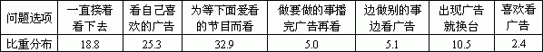 总体上有27.7%的受众主动而且是喜欢看广告或部分广告,有51.7%处在被动状态收看电视广告,在广告播出时一直看下去或为等下面的节目看下去,有10.1%的受众在广告时去做其它的事或边做事边看,只有很小一部分(10.5%)受众在播出广告时换台。由此看来,无论是主动收看还是被动收看,绝大部分受众在播出电视广告时通常不会采取“过激”行为换台,电视广告播出时的有效收看效果还是相当不错的。