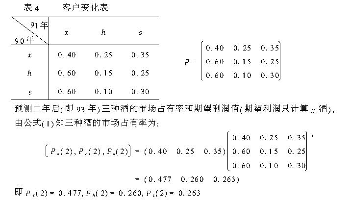 四 实例分析 通过对吉林省某市花樱酒厂生产的三种滋补酒(分别用代号x—熊胆酒、h—回春酒、s—三鞭酒)市场调查统计出,90年三种酒在同类产品中市场占有率分别为40%,25%和35%。90—91年购买三种酒的客户流动情况见表4,相应的概率转移矩阵为P。